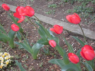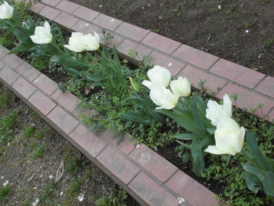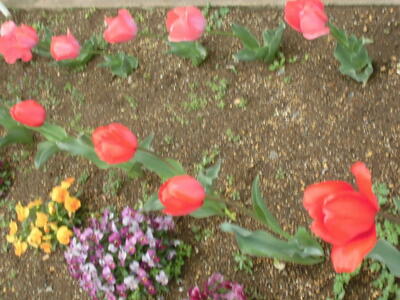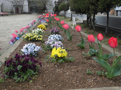 春休み2日目です。学校の花壇ではチューリップがきれいに咲いています。