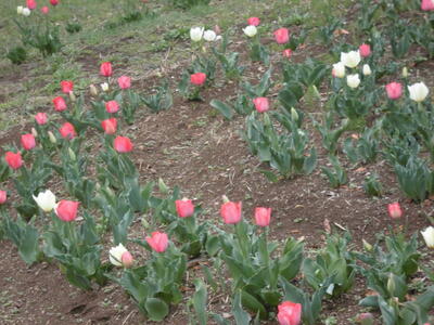 ( ↓ 体育館前のチューリップ園では、まだまだこれから咲くチューリップがたくさんあります。)