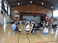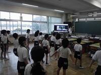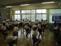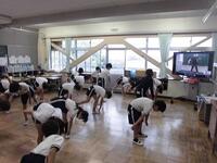今日は朝から雨が降っています。そんな中、今日の朝の活動はさわやかタイムでした。各教室で机を端に寄せ、モニターに映し出されるインストラクター(本校教諭)の動きを真似して、体を曲げたり、伸ばしたり、リズムに乗って跳んだり・・・、体をほぐしました。
