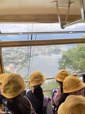 河口湖を一望できるロープウェイです。雲が多めで富士山頂は見えませんでしたが、街並みはよく見えました。