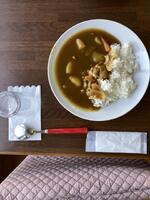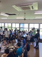 ここでお昼ご飯をいただきます。メニューはカレーです。子供の中には10時過ぎには「お腹が減った」と言っていた子もいました。全員完食しました。たりなかった子もいるかもしれませんので、夕ご飯でリカバーしてください。この後、桃狩りに行きます。