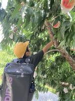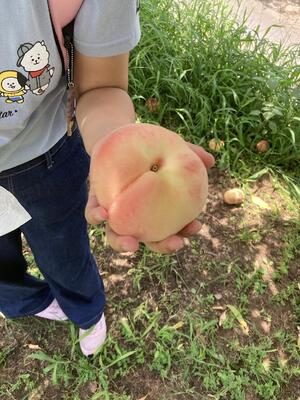 昼食後、桃狩りを行いました。どれも大きな桃でどれにしようか迷ってしまいましたが、自分で選んで収穫しました。桃は追熟が必要とのことですので、持ち帰りましたら常温で数日置いておくと良いそうです。桃の甘い香りがしてきたら食べ頃とのことです。