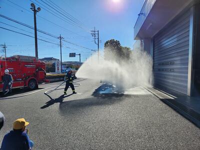 放水を見せてもらいました。ホースが水圧でパンパンに。子どもたち真剣に見学しました。