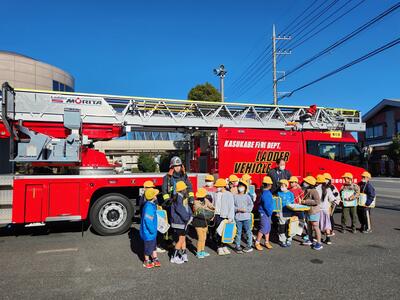 40メートルのはしごを備えたはしご車、時価二億円、命を守る最新設備の前でハイチーズ。貴重です。