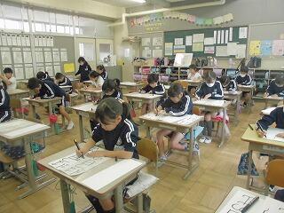 今日は、1・2年生は教室で、3・4年生は体育館で、それぞれ競書会を行いました。1年生は「お正月」、2年生は「はつ日の出」をペン書きします。3年生は「せかい」、4年生は「竹うま」を毛筆で書きます。1文字の大きさや漢字とひらがなのバランス、ひらがなのやわらなかカーブなど、一文字一文字に気をつけながら書きました。どの子も真剣に、一筆に思いを込めて丁寧に書きました。