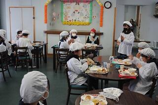 今日は6年2組が卒業記念のバイキング給食でした。唐揚げ、ポテト、エビフライ、デザート、ジュース、加えてカレーライスに大豆のサラダ。色とりどりに盛り付けられた大皿を見て、子供たちもびっくりしていました。普段とは違う給食に自然と笑顔がこぼれます。小渕小で食べる給食は残り7回。よくかんでこの味を覚えていってくださいね。