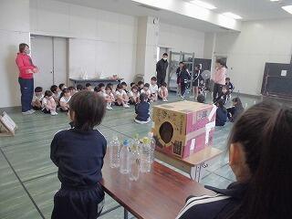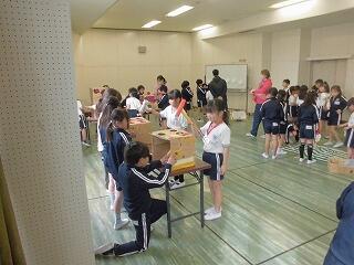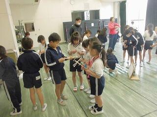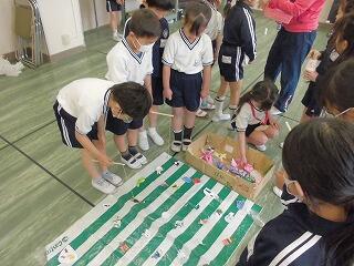 今日は2年生が1年生を遊びランドに招待しました。磁石を使った魚釣りや輪投げ、空気報、もぐらたたきなどなど、会場には手作りの遊びがいっぱい。招待された1年生は目をキラキラさせながら体験していました。1年生のはじける笑顔と2年生の優しく教える姿がとても印象的でした。1年生はお土産もたくさん持ち帰りました。とても楽しいひと時でした。2年生、ありがとう!!