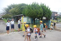 火災で煙から身を守る学習のあと、消火器の使い方、実践を学びました。