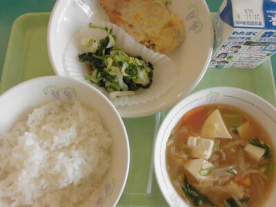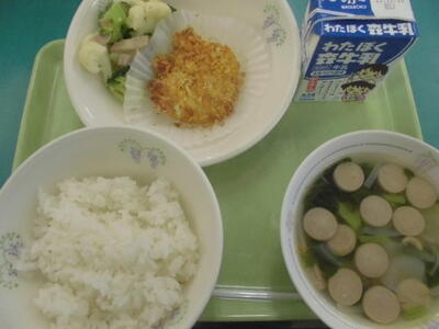 15日の給食は、ごはん、牛乳、キャベツ入りメンチカツ、おかか和え、ピリ辛みそ汁、でした。