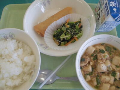 ⒋日の給食は、ごはん、牛乳、春巻き、小松菜の中華サラダ、マーボー豆腐、でした。
