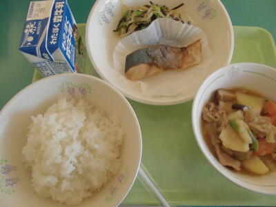 5日の給食は、ごはん、牛乳、ぶりの照り焼き、塩昆布あえ、肉じゃが、でした。