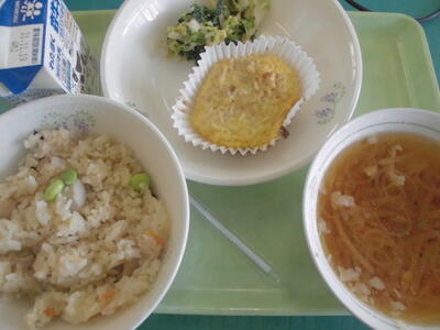10日の給食は、吹き寄せごはん、牛乳、卵焼き、春菊のごま和え、沢煮椀、でした。