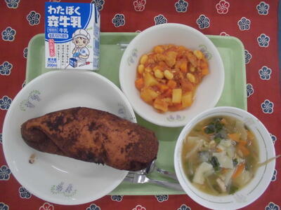 今日のメニューは、ココア揚げパン、牛乳、ポークビーンズ、ワンタンスープです。
