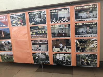 ( ↓ 学校の掲示物。職員室前の廊下には、今年度の学校の歩みが、写真で示されています。来校の際には、ご覧になって下さい。)