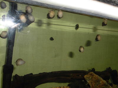 (タニシがたくさんいます。タニシの裏側がよく見えます。)