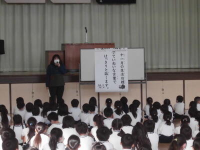 今月の生活目標のお話がありました。今月の生活目標は「ていねいな言葉で、はっきりと話します。」です。
