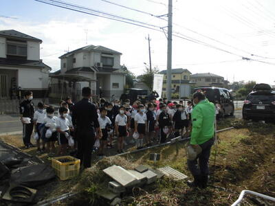 ( ↓ 3年生が畑に到着しました。栽培ボランティアさんから説明をいただき、イモ掘りにうつりました。)