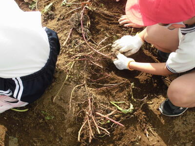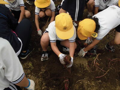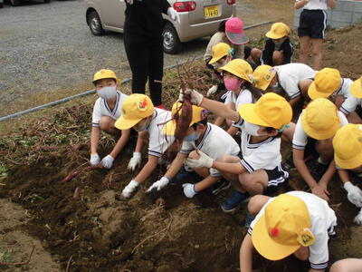 本日は、校外にお借りしているサツマイモ畑で、サツマイモ掘りがありました。1・2・3年生が、一学期に植えたサツマイモの苗が、順調に育ち、イモができました。栽培ボランティアさん、花植えボランティアさんにご協力いただき、1・2・3年生がサツマイモを掘り出しました。