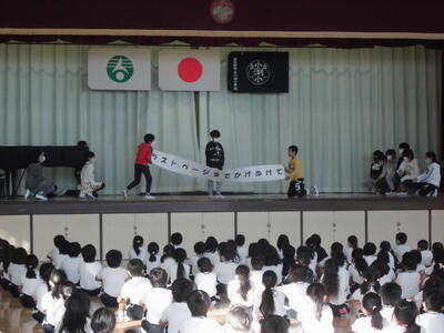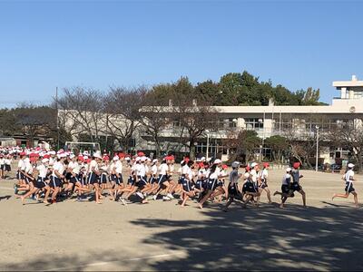 本日の朝は体育朝会。今月末の持久走大会にむけて、全校児童が5分間走に挑みました。