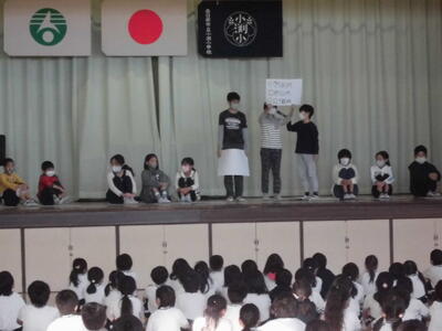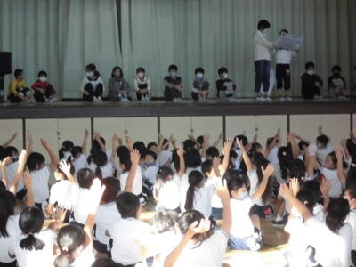 ( ↓ 図書委員による「本いっぱい集会」。クイズや、イベントの紹介がありました。)