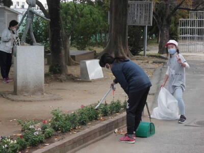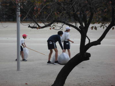 この時期は、大量の落ち葉が舞います。校庭や学校周りの落ち葉を、保健の先生、音楽の先生、校長先生、校務員さんが掃き集めています。