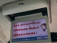 バスに乗車しました。車内でも、感染症対策のための説明が画面から流れます。