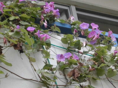 ↓ 夏から咲いていたグリーンカーテンのリュウキュウアサガオもそろそろ咲き終わります。夏から、大きな花が咲き続けていました。