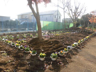 ↓ 校長先生や校務員さんが除草し木の根を掘り起こした草地に、土を入れ、球根や花を植えました。