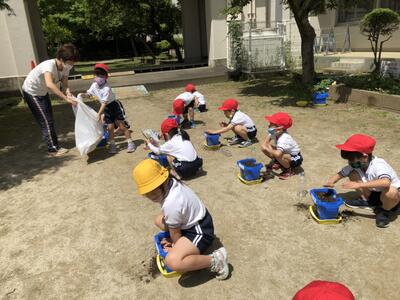 連休明けの本日の学校です。一年生が、アサガオの種まきをおこないました。