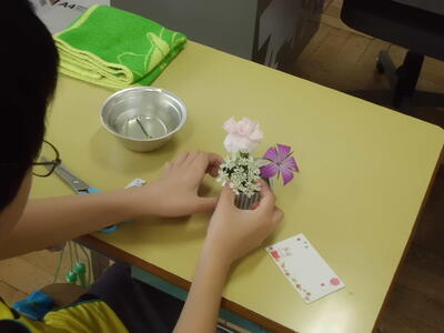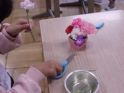 たんぽぽ・ひまわり学級が、フラワーアレンジメントをおこないました。あさってが母の日であるのにちなんで、お家の方に感謝の気持ちをこめて渡すためのお花をつくりました。