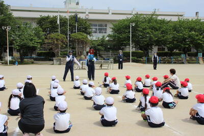 春日部警察署と春日部市役所の方、交通指導員さん・交通安全ボランティアさんをお招きして、子供たちに交通安全について教えていただきました。