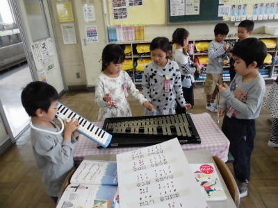 今日は、けん盤ハーモニカ、鈴、鉄琴、トライアングルを使って合奏の練習です。