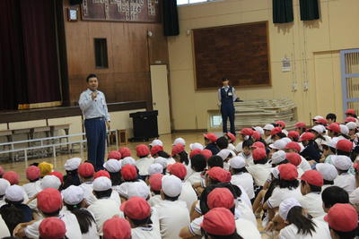 震度6の地震が起きたことにより火災が発生したという想定での避難訓練を行いました。本日は雨のため、体育館に避難しました。その様子を春日部消防署の方に見ていただき、訓練後に子どもたちへお話をしてもらいました。