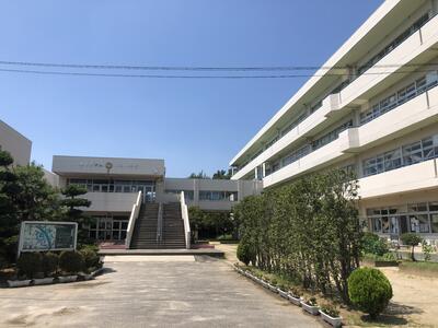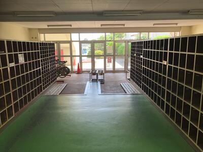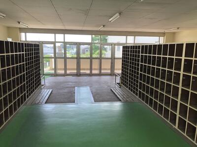 ( ↓ 昇降口も子供たちの登校を待っています)