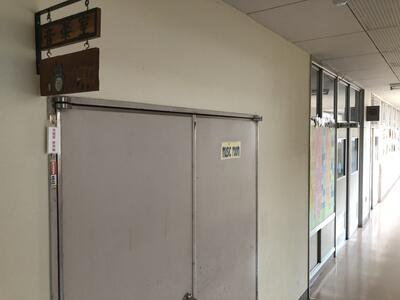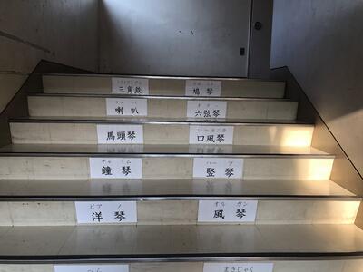 管理棟の二階の音楽室・図工室へあがる階段には、音楽・図工にちなんだ漢字の掲示があります。