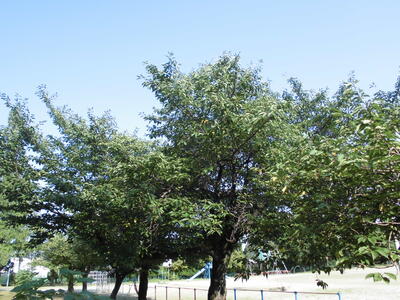 ( ↓ 写真は昨日の午後の学校。空は晴れわたり、木の間からはセミの鳴き声が響いています。)