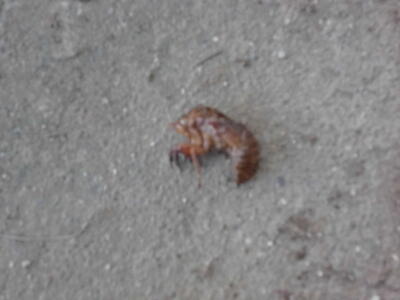 ( ↓ セミの抜け殻を見つけました。頭上の木の上で鳴いているセミのものでしょうか。)