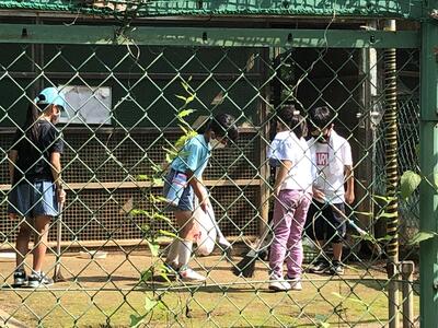 ( ↓ 校務員さんの除草作業。)