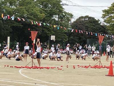 10:45 プログラム10番、1・2年生による、チェッコリ玉入れが始まります。かわいらしいダンスなどに玉入れが始まります。