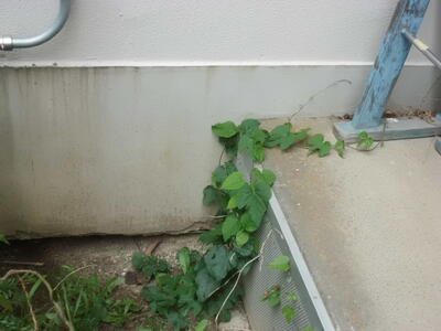「小渕水族館」の前の廊下の天井に、アサガオ(リュウキュウアサガオ)のツルが伸びてきています。校舎の外側から、昨年咲いたアサガオが落とした種が、すき間を見つけて校舎の内側に伸びてきたようです。