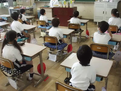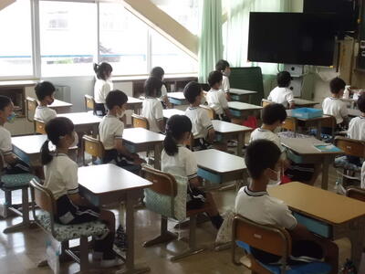 本日の朝は、お話朝会です。感染症対策のため、放送で朝会を行いました。