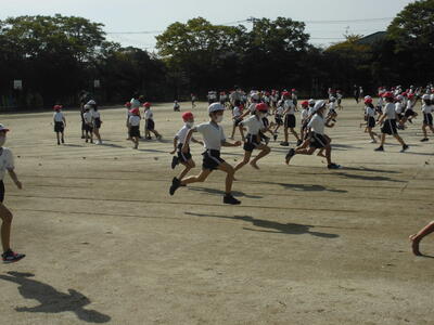 ( ↓ 校庭いっぱいに広がって整理体操をしました。)