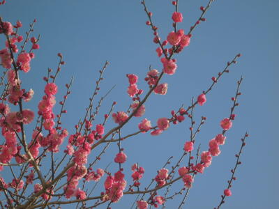 学校では、梅の花がきれいに咲いて、晴れた日は、赤い花が青い空に映えています。よい香りもただよっています。(下は先日の金曜日の写真です)