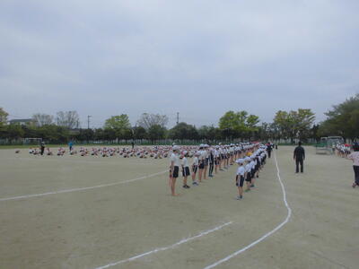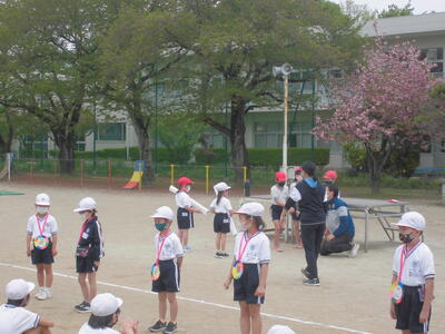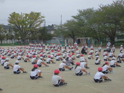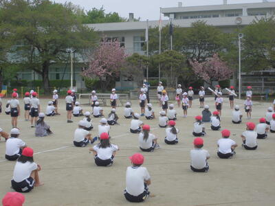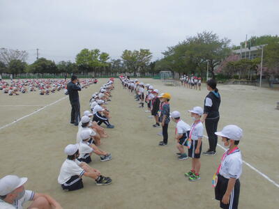 今日の朝は「一年生を迎える会」でした。密を避けるため、校庭でじゅうぶんに児童同士の間隔をあけておこないました。