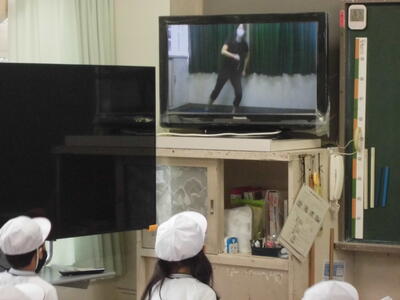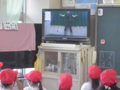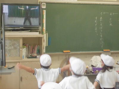 ( ↓ テレビ画面の先生の動きに合わせて、教室で体を動かしてみます。)