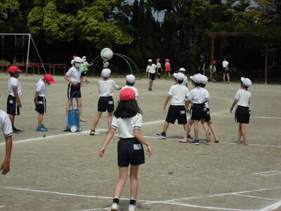 ( ↓ 午後の4年生の体育。ボール投げの練習をおこなっています。)