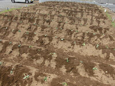 6月になりました。今日は、サツマイモ畑で1~3年生が苗植えをおこないました。