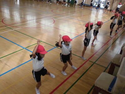 いよいよ今週末は運動会です。雨天のため、体育館で、低学年(1・2年生)が合同で練習をおこなっています。