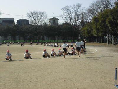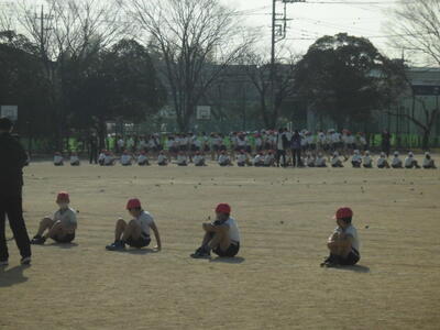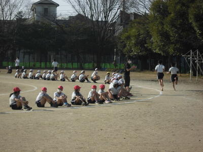 ( ↓ 下級生が見守る中、5分間を走りきりました。6年生は呼吸を整えています。いよいよ、この後は下級生のスタートです。)