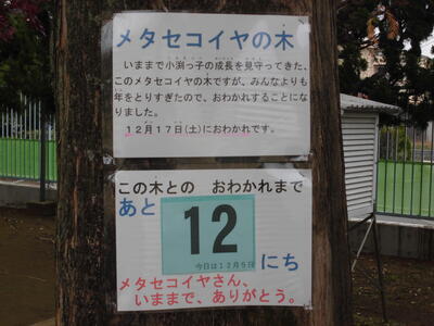 学校だよりやホームページでお知らせしてきた学校のメタセコイヤの木の伐採が、12月17日(土)に決まったとのことです。学校では、メタセコイヤの木に残り日数を掲示して、お別れまでの時間を大切にしています。
